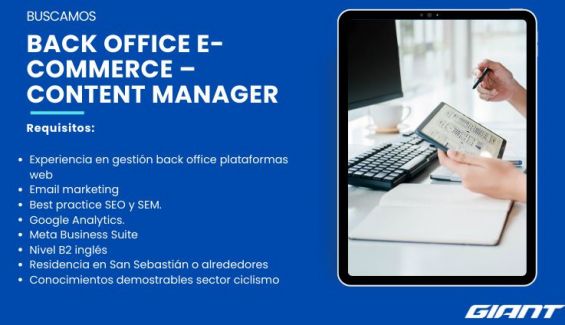 Desde el grupo Giant Ibérica nos hacen llegar esta oferta de trabajo. Una plaza de BACK OFFICE E-COMMERCE –CONTENT MANAGER para su departamento de marketing en sus oficinas de San Sebastián. Un puesto de trabajo en el que el personal debe administrar los contenidos web y proporcionar soporte al equipo Comercial y Marketing.